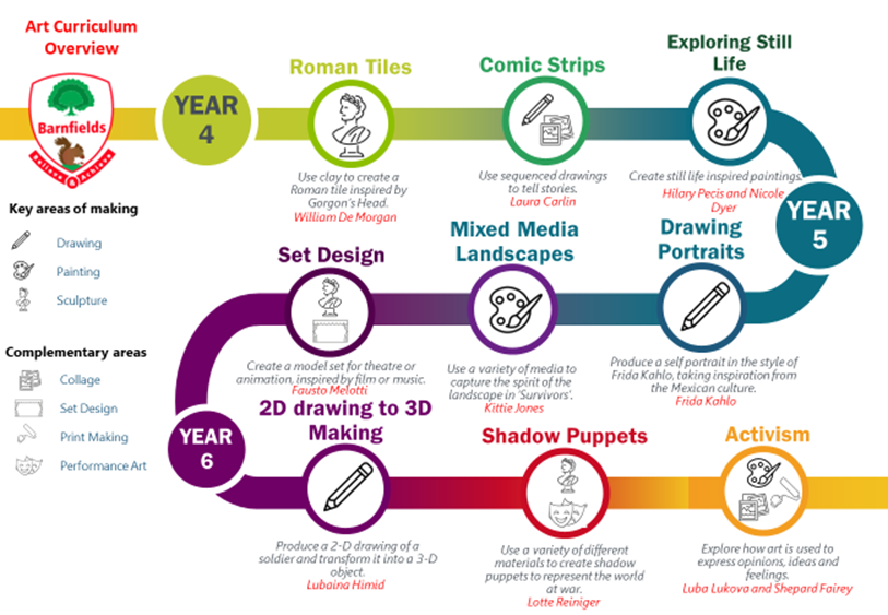 The Art curriculum at Barnfields is underpinned by the National Curriculum. It is carefully sequenced across a series of high-quality lessons to provide children with opportunities for in-depth exploration of various techniques and processes.
